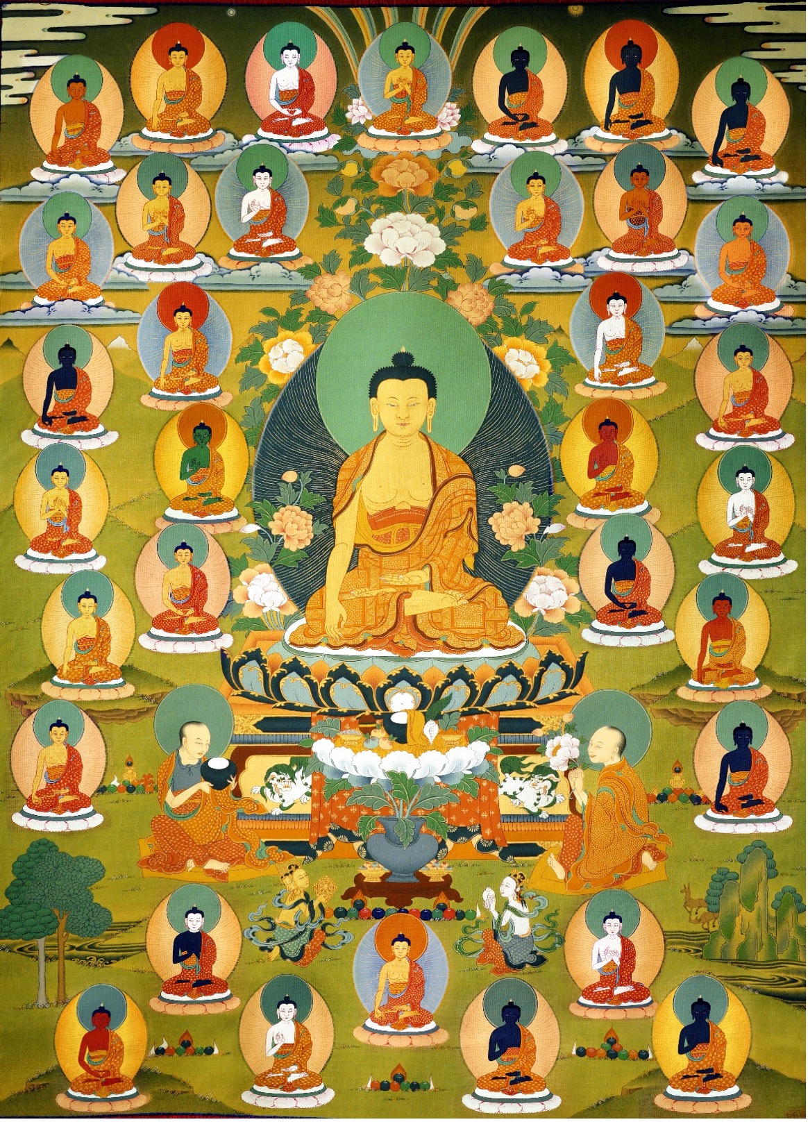 这三十五尊佛,每一尊佛的身体颜色、手印,手里的法器都不一样,要把这么多佛观想得一清二楚有点难。所以,还有一个简单的办法,就是把所有佛的颜色观想为白色,因为这个时候我们是为了消业、忏悔。如果实在观想不清楚,那也可以用最简单的方法:先看这个唐卡,再把三十五尊佛的名号都背下来,然后心里想,这些佛现在就在我的面前,这样也可以。