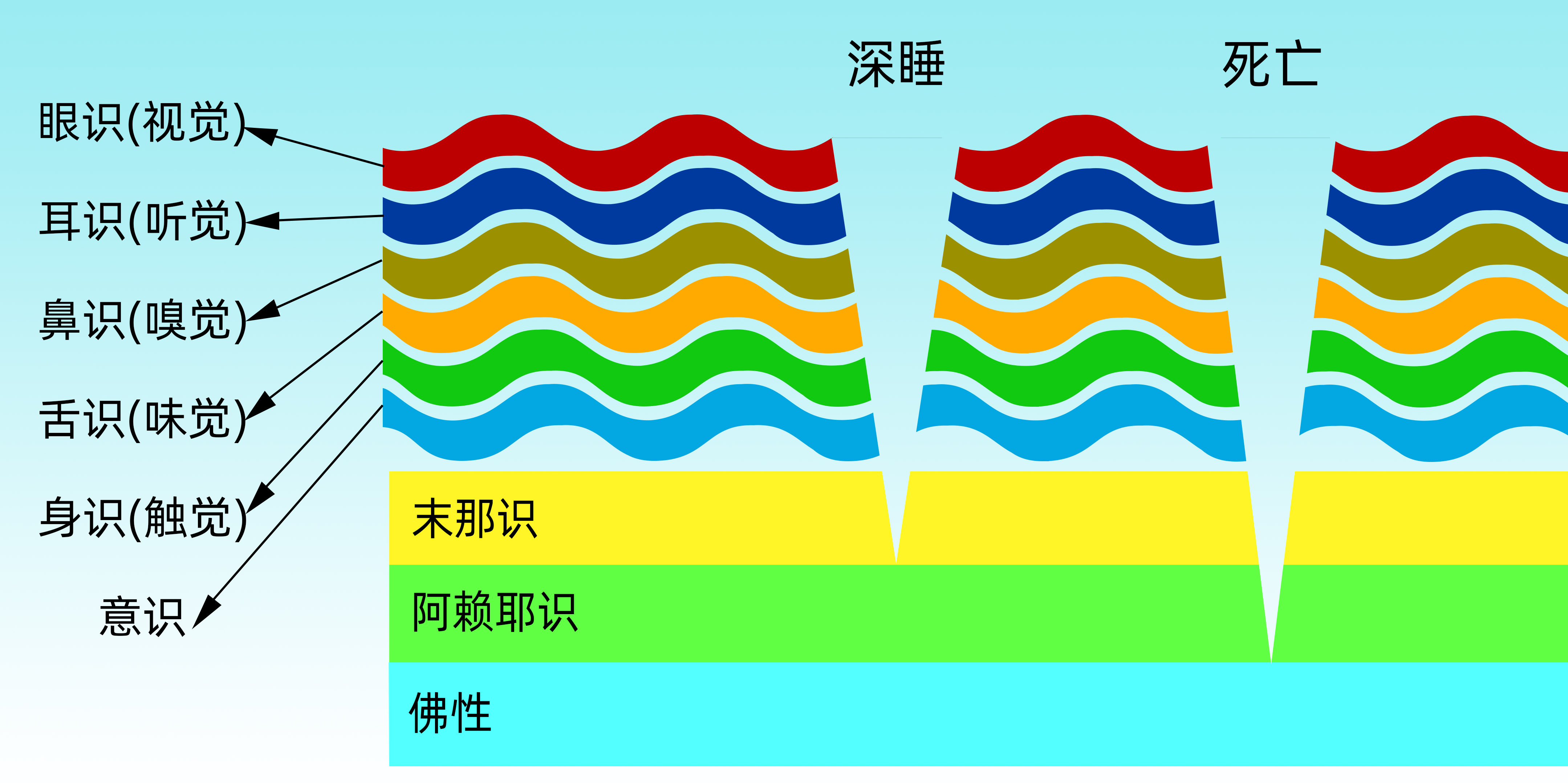 这九层意识中,上面的六层是波纹形的,如同海浪一般。为什么是波纹形?因为它们不稳定、波动比较大,时有时无——有些时候有,有些时候会消失;消失之后又会诞生,诞生后又会消失。